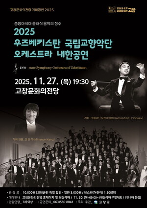 중앙아시아 최고 수준을 자랑하는 우즈베키스탄 국립교향악단이 고창을 찾아 깊어가는 가을밤을 클래식 선율로 물들인다.고창군은 오는 27일 오후 7시 30분 고창문화의전당에서 ‘우즈베키스탄 국립교향악단 오케스트라 내한공연’을 개최한다고 25일 밝혔다.우즈베키스탄 국립교향악단은 우수한 젊은 음악가들로 구성된 단체로, 미국과 유럽 등지에서 순회공연을 성공적으로 마치며 실력을 인정받았다. 이번 공연 1부는 강민석 한양대 교수가 지휘와 해설을 맡아 관객들의 이해를 돕고, 2부는 우즈베키스탄 국립음악원 총장인 카몰리딘 우린바예프가 지휘봉을 잡아