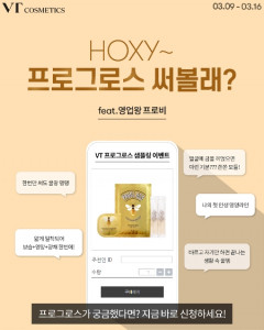 코스닥 상장사 브이티지엠피(VT GMP)의 화장품 사업 부문 브랜드 브이티 코스메틱(VT COSMETICS)이 오는 16일까지 신제품 영양 라인 프로그로스를 체험할 수 있는 샘플링 이벤트를 진행한다. 프로그로스 샘플링 이벤트는 지난 2월 브이티 코스메틱이 선보인 신제품 영양 라인, 프로그로스 마스크 3종을 체험해볼 수 있는 이벤트다. 온라인 공식몰에서 오는 16일까지 신청 가능하며, 1,000명에게 신제품 마스크 3종을 체험해볼 수 있는 기회가 주어진다. 선착순으로 진행되는 이벤트인 만큼 조기 마감될 수 있다. 샘플링 외에도 ‘영업왕 프로비’ 이벤트가 추가적으로 진행돼 눈길을 끈다. 이벤트 신청 시 추천인 코드를 입력할 수 있는데 이때 1