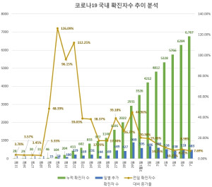 신종 코로나 바이러스 감염증(코로나19) 국내 확진자 수가 날마다 늘고 있지만 이달들어 증가율은 지속적으로 떨어지고 있는 것으로 나타났다.8일 글로벌빅데이터연구소(소장 김다솜)가 질병관리본부 공식 자료를 바탕으로 지난 달 11일 이후 이달 7일 오후 4시까지 코로나19 국내 확진자 발생 현황을 분석한 결과 이같이 조사됐다.지난달 11일 28번째 확진자가 나온 이후 5일만인 지난달 16일 29번째, 다음날인 17일 30번째 확진자가 나올때만 해도 국내 상황은 안정적이었다.같은 달 18일 신천지 교인인 31번째 확진자가 나오면서 상황이 급변하기 시작, 19일엔 하루 15명의 확진자가 늘면서 누적 확진자 수가 46명을 기록했고 20일엔 104명으로