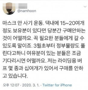 코로나19 감염 확산이 우려되면서 '마스크 대란'이 지속되는 가운데, 온라인 상에서는 시민들 사이에서 '마스크 안 사기' 운동이 큰 호응을 얻고 있다. 취약계층이나 마스크를 아직 한 장도 구입하지 못한 사람들에게 공적물량 몫을 양보하자는 취지에서다. '마스크 안 사기' 운동은 지난 1일 한 소비자는 트위터를 통해 마스크 안 사기 운동을 실천하자는 글을 게시하면서 발단이 됐다. 이날 소비자 김모씨는 트위터를 통해 "마스크 안 사기 운동. 댁내에 15~20여개 정도 보유분이 있다면 당분간 마스크를 구매 안하시는 것이 어떨까요"라며 "지금은 자제하셨다가 꼭 필요한 분들에게 갈 수 있도록 하고, 3월 초부터는 공적 물량도 풀려 구매가