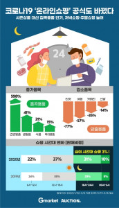 코로나19가 온라인쇼핑 패턴을 바꾸고 있다.이베이코리아가 국내 코로나19 확진 발표가 있었던 지난 1월 20일부터 3월 3일까지 G마켓과 옥션의 판매 빅데이터를 작년 동기간(2019.1.19.~3.3)과 비교 분석한 결과, 상품군 및 쇼핑 시간대 등에 변화 추이를 보인다고 6일 밝혔다.먼저 상품군의 경우, 시즌 요인보다는 활동 장소가 판매량에 크게 영향을 줬다. 이른바 ‘집콕’ 상품이 증가 추세를 보였고, 바깥 활동에 필요한 ‘야외 외출용’ 상품은 예년에 비해 주춤한 모습을 보였다. 지난해 같은 시기, 패션의류 등의 봄시즌 상품 및 캠핑, 등산용품 등이 인기를 끌었던 것과 비교된다.성장폭이 큰 품목으로는 마스크와 손소독제 등 개인위생 제