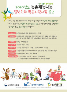 한국농어촌공사는 '2020년 농촌재능나눔 활동지원사업'에 참여할 단체와 대학을 모집한다고 24일 밝혔다. 농촌재능나눔 활동지원사업은 농촌마을 활성화와 주민 삶의 질 향상을 위해 농림축산식품부 주최 재능 나눔 프로그램이다.먼저 공모분야는 '일반단체 활동지원사업'과 '대학별 특화마을조성 활동지원사업'으로 나뉜다. 직능·사회봉사 단체나 기관·단체, 전국 대학 및 대학 내 사회봉사센터면 누구나 참여 가능하다.참여를 원하는 단체는 고시된 농촌마을 중 활동 마을을 선택해, 지역공동체 및 경제 활성화, 주민건강 및 복지증진, 생활환경 및 마을환경 개선, 주민교육 및 문화증진 부분의 활동 지원사업 사업계획서 등을 작성해 제출하