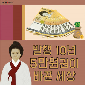 가로 154㎜, 세로 68㎜. 오는 23일 신사임당 이미지가 담긴 5만원권이 시중에 유통된지 열살을 맞는다. 지난 2009년 등장한 5만원권은 화폐 시장을 평정하면서 10년 만에 대세 은행권으로 자리매김했다. 지난 10년의 세월 동안 발행량만 장수로 따지면 대략 40억장이다. 이를 차곡히 쌓으면 에베레스트산의 50배 높이가 되고, 가지런히 세로로 이어 붙일 경우 지구를 열다섯 바퀴 돌고도 남는 길이가 나온다. 5월 현재 환수액(한국은행으로 회수된 액수)을 제하고 시중에 유통 중인 5만원권은 98조3226억원에 이른다. 은행권뿐 아니라 주화를 포함한 모든 화폐량의 82.8%에 해당하는 액수다. 한국은행이 지난해 실시한 ‘2018년 경제주체별 현금사