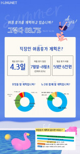 직장인의 절반 이상은 극성수기인 '7말 8초'에 휴가를 떠나며 평균 59만 6천원을 소비할 계획인 것으로 조사됐다.평생교육 대표기업 휴넷은 직장인 1천106명을 대상으로 설문 조사한 결과 응답자의 83.7%가 올해 여름 휴가를 계획하고 있다고 12일 밝혔다.올해 여름 휴가 기간은 평균 4.3일로 집계됐으며, 기간별로 살펴보면 3일(33.9%), 5일(24.6%), 4일(16.2%), 7일 이상(14%) 순이었다.평균 여름 휴가 비용은 평균 59만 6천원으로, 작년 평균 51만 7천원보다 7만 9천원 더 쓰는 것으로 조사됐다.'30만원 이상∼50만원 미만'이라는 응답이 28.1%로 가장 많았다.'100만원 이상'이 24.4%로 2위를 차지했고 '10만원 이상∼30만원 미만'이 16.8%, '