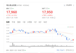 국내 소프트웨어 기업 이스트소프트 주가가 들썩이고 있다.25일 한국거래소에 따르면 이날 오전 10시 37분 현재 4.12% 상승 1만 7960원에 거래되고 있다. 주가는 깊은 숨고르기에서 벗어나려 하고 있다. 외국인은 4거래일 연속 매수했으며 기관은 20거래일 대량매수 하고 있다.실적이 바닥을 지나고 있다는 인식에 매수세가 몰리고 있는 것으로 풀이된다.이스트소프트가 3분기 실적 발표에서 영업손실 45억원을 기록하며 적자 폭이 확대됐다.매출은 250억원으로 전년 동기 대비 소폭 증가했지만, 글로벌 AI SaaS 플랫폼과 AI 사업 확
