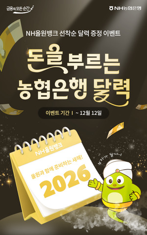 NH농협은행은 연말을 맞아 고객 성원에 보답하고자 오는 12월 12일까지 ‘2026년 농협은행 달력 증정 이벤트’를 진행한다고 25일 밝혔다.이번 이벤트는 NH올원뱅크 이벤트 페이지에서 세 가지 디자인 중 원하는 달력을 선택해 신청하면 되며, 총 2만5000명에게 선착순으로 제공된다. 신청한 달력은 고객이 입력한 주소로 무료 배송된다.농협은행 관계자는 “새해의 풍요와 행운을 기원하는 마음을 담아 달력 증정 이벤트를 준비했다”며 “NH올원뱅크의 다양한 금융 서비스와 함께 뜻깊은 2026년을 맞이하시길 바란다”고 말했다.