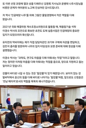 (나주=핀포인트뉴스)오해준 기자=나주시가 인공태양 연구시설 우선협상 부지로 선정되자 지역 정치권이 일제히 환영의 뜻을 밝히며 전폭적인 지원을 약속했다.전남 나주시가 과학기술정보통신부의 인공태양(핵융합) 연구시설 부지 1순위로 선정된 가운데, 더불어민주당 등 지역 정치권이 24일 페이스북에서 환영의 메지지를 보냈다.지역구 국회의원인 신정훈(나주·화순) 의원은 이날 "나주를 비롯한 전남의 큰 경사"라며 환영했다. 신 의원은 시민들의 염원과 김영록 도지사, 윤병태 나주시장 등 관계자들의 노고에 감사를 표했다.그는 자신의 역할을 '밑강