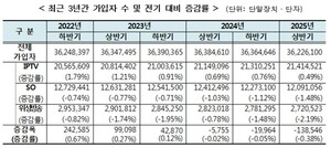 올해 상반기 유료방송 가입자 수가 약 14만명 줄며 3개 반기 연속 감소했다. 방송미디어통신위원회가 24일 발표한 ‘2025년 상반기 유료방송 가입자 수 및 시장점유율’에 따르면 상반기 유료방송 가입자 수는 3622만6100명으로 집계됐다. 이는 지난해 하반기 대비 13만8546명 감소한 수치다. 전체 가입자 규모는 지난해 상반기 처음 줄어든 이후 3개 반기 연속 감소세를 보이고 있다.플랫폼별로는 인터넷(IP)TV만 가입자가 늘었다. IPTV 가입자는 2141만4521명으로 지난해 하반기보다 0.49% 증가했다. 반면 종합유선방송(