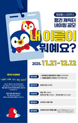 제일헬스사이언스는 브랜드 캐릭터 공식 네이밍 공모전을 진행하며 소비자와 더욱 긴밀하게 소통하기 위한 참여형 브랜드 활동을 본격화한다고 24일 밝혔다.이번 공모전은 임직원뿐 아니라 일반 소비자 누구나 기업의 공식 캐릭터에 적합한 이름과 스토리를 직접 제안할 수 있는 기회로, 다양한 세대의 창의적 아이디어를 반영해 감성적이고 친근한 브랜드 아이덴티티를 완성하기 위한 전략의 일환이다.공모 기간은 12월 12일까지이며 응모는 자유 양식으로 작성해 지정된 이메일로 제출하면 된다. 시상 내역은 대상 1명(50만원), 최우수상 1명(30만원),