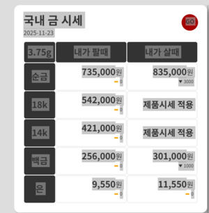국내 금 시세가 연말을 앞두고 소폭 조정을 받으며 시장이 숨 고르기에 들어갔다.23일 기준 3.75g 순금(24K) 기준 매입가격은 73만5천 원, 판매가격은 83만5천 원으로 나타났다. 전일 대비 매입가는 변동이 없었고, 판매가격은 소폭 하락하며 3천 원 내린 가격을 기록했다. 순금 가격은 지난달 고점을 지나면서 안정권에 접어든 모습이다.18K는 팔때는 54만 2천원, 14k 팔때 42만 1천원이다.다만 제조·디자인 방식에 따라 금제품 매입 가격의 격차는 여전했다. 금 시세가 안정되면서 금제품별 ‘감가 폭’이 투자자들의 관심 요소