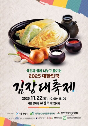 서울시는 한국농수산식품유통공사, (사)대한민국김치협회와 오는 22일 오전 10시부터 오후 6시까지 양재동 aT센터 제2전시장(3층)에서 ‘2025 대한민국 김장대축제’를 개최한다.이번행사는 김장철을 맞아 시민들이 유네스코 인류무형문화유산인 김장문화를 체험하고, 저렴한 가격으로 김장재료를 구매할 수 있도록 마련됐다.행사장에서는 배추, 고춧가루, 마늘, 생강, 양파, 젓갈 등 주요 김장 재료부터 ‘대한민국 김치 품평회’ 수상 제품까지 다양한 국산 김치와 김장 재료를 최대 50% 할인된 가격으로 판매한다. aT 바로마켓 참여 농가 18곳