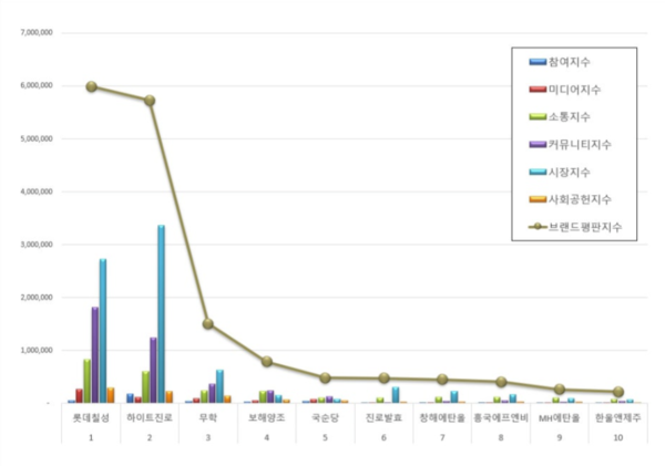 한국기업평판연구소에서 실시한 음료 상장기업 브랜드평판 11월 빅데이터 분석결과, 1위 롯데칠성 2위 하이트진로 3위 무학 순으로 분석됐다.10월 21일부터 11월 21일까지의 음료 상장기업 브랜드 빅데이터 16,313,003개를 분석했습니다. 지난 10월 음료 상장기업 브랜드 빅데이터 16,289,211개와 비교하면 0.15% 증가했습니다. 세부 분석을 보면 브랜드소비 14.43% 하락, 브랜드이슈 26.64% 하락, 브랜드소통 11.11% 상승, 브랜드확산 2.24% 상승, 브랜드시장 0.03% 하락, 브랜드공헌 0.14% 하락했