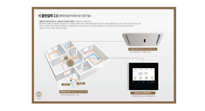 또한 현대건설은 전열교환 환기장비 및 천장형 공기청정기를 연계한 하드웨어 장치, 광플라즈마 기술을 활용한 살균장치, 실내외 공기질을 측정해 상황에 맞도록 자동으로 운전하는 센서 유닛 일체형 제어기 등도 통합하여 개발했다.