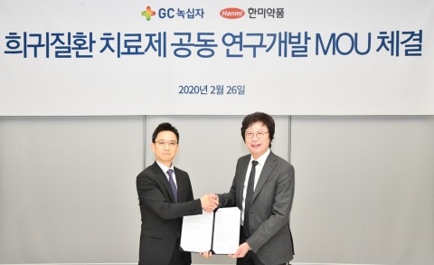 한미약품과 GC녹십자는 26일 경기도 용인 GC녹십자 본사에서 ‘차세대 효소 대체 희귀질환 치료제’ 공동 개발에 관한 MOU를 체결했다고 27일 밝혔다.