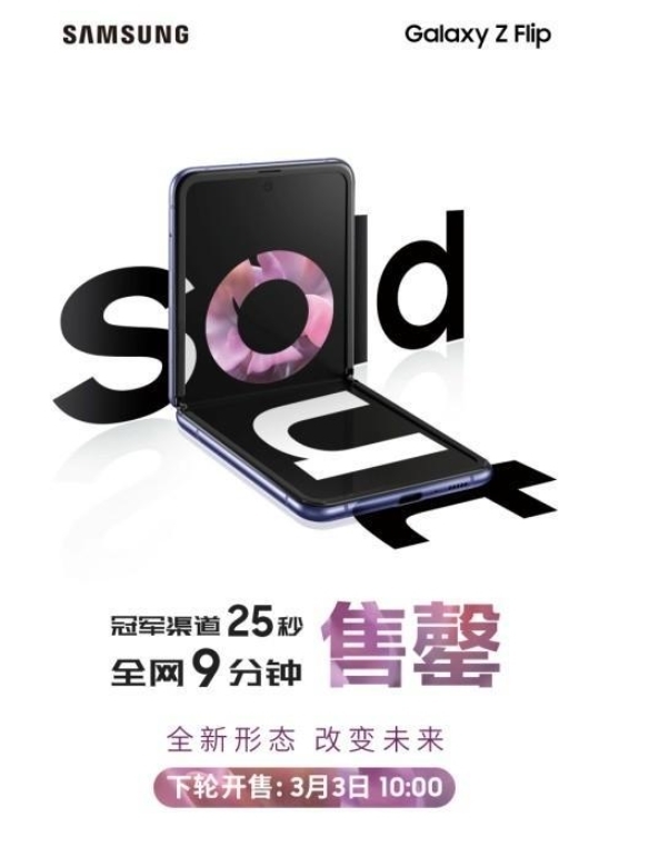 29일 업계에 따르면 삼성전자는 티몰, 징둥닷컴, 쑤닝 등 중국 온라인 채널에서 갤럭시 Z플립 판매를 시작했다. 준비된 물량은 판매 9분 만에 전량 매진됐다. 특히 쑤닝에서는 판매 시작 25초 만에 모든 재고가 소진되는 사태가 벌어지기도 했다. 코로나19 확산에 따라 유통 시장이 급속도로 얼어붙고 있다는 점을 감안하면 이례적인 행보다.