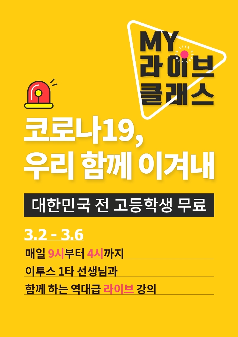 [핀포인트뉴스=차혜린 기자] 입시전문기업 이투스교육(주)은 ‘코로나19’ 확산으로 개학이 연기돼 학습 공백을 우려하고 있는 학생들을 위해 자사의 온라인 강의 사이트인 ‘이투스닷컴’의 스타강사들이 직접 강의하는 무료 ‘온라인 라이브 클래스’를 진행한다고 2일 밝혔다.