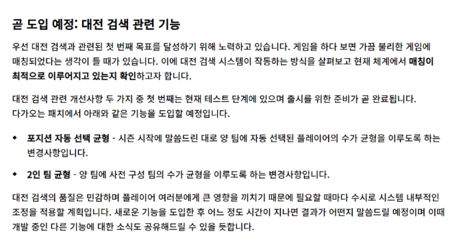 그러면서 "이에 포지션 자동 선택 균형과 2인 팀 균형을 곧 선보이고자 한다"며 "수시로 시스템 내부적인 조정을 적응할 계획"이라고 덧붙였다.