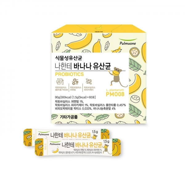 나한테 바나나 유산균은 락토바실러스와 비피더스 등 프로바이오틱스 4종에 프리바이오틱스 5종을 더했다. 프로바이오틱스 4종 중에는 풀무원이 독점 개발해 특허를 받은 식물성유산균PMO08(락토바실러스 플란타룸)이 포함돼 있다. 소화효소로 알려진 α-아밀라아제도 들어있다.