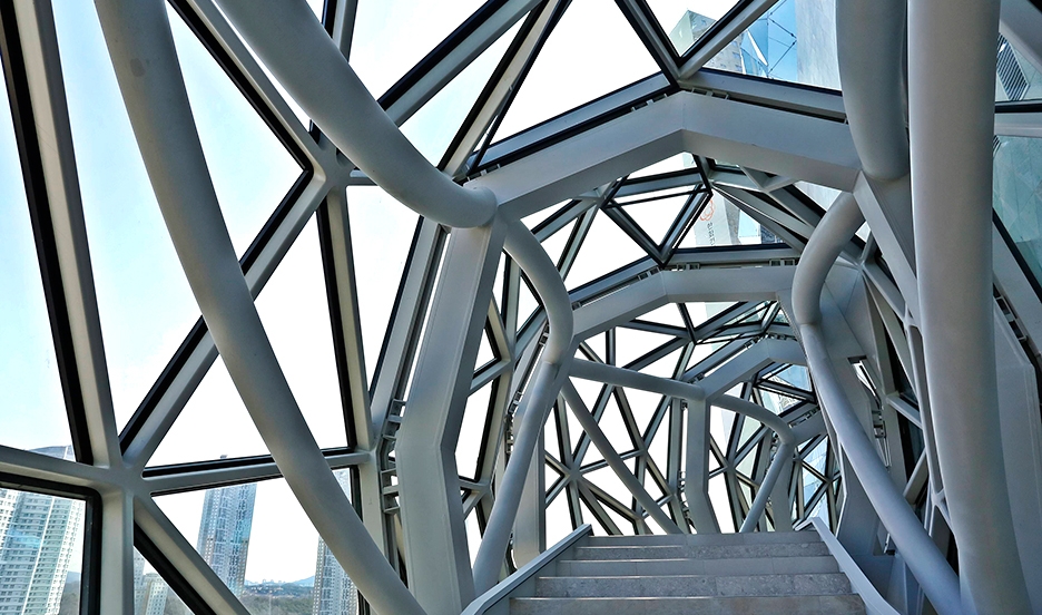 유리통로가 '거대한 암석층의 단면의 외관'을 휘감기며 백화점 전 층에 '빛'이 관통