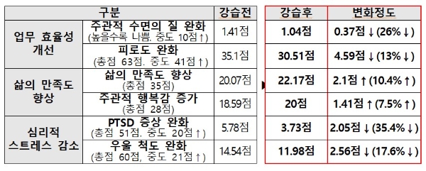 삶의 만족도 역시 14.33점→18.42점으로 향상, PTSD 증상은 16점→8.25점으로, 우울증상은 21.75점→14.83점으로 각각 완화돼 일반 참가자 수준으로 증상이 완화됐다.