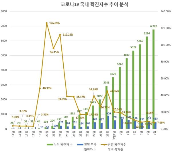 이날을 고비로 확진자 증가율이 조금씩 낮아지면서 7일엔 483명 증가에 그쳤다.