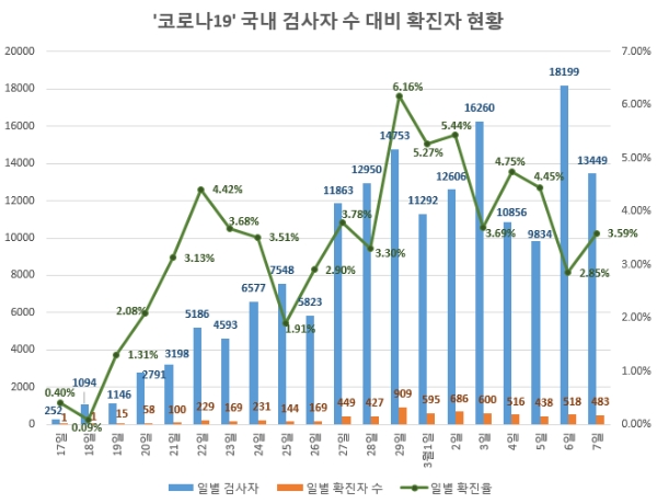 이후 하루 검사자수는 최저 9,834건에서 최고 1만8,199건이었는데 전날인 이달 7일엔 1만3,449건 검사에 483명 확진으로 3.59%의 확진율을 보였다.