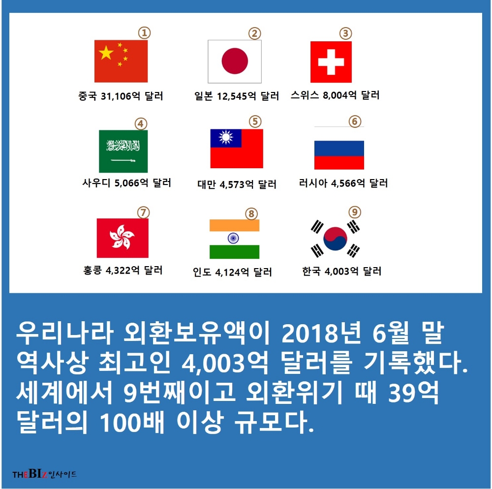 우리나라 외환보유액이 2018년 6월 말 역사상 최고인 4,003억 달러를 기록했다. 세계에서 9번째이고 외환위기 때 39억 달러의 100배 이상 규모다.