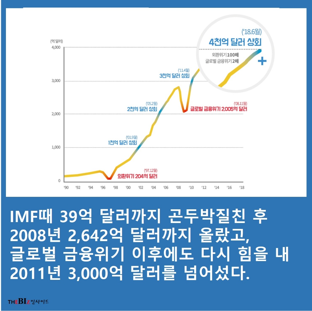 IMF때 39억 달러까지 곤두박질친 후 온 국민의 다시해보자는 한마음으로 2008년 2,642억 달러까지 올랐고, 글로벌 금융위기 이후에도 다시 힘을 내 2011년 3,000억 달러를 넘어섰다.