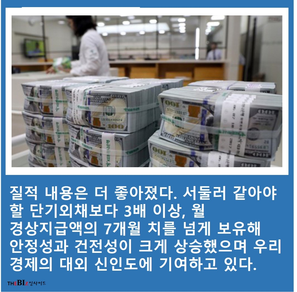 질적 내용은 더 좋아졌다. 서둘러 같아야 할 단기외채보다 3배 이상, 월 경상지급액의 7개월 치를 넘게 보유해 안정성과 건전성이 크게 상승했으며 우리 경제의 대외 신인도에 기여하고 있다.