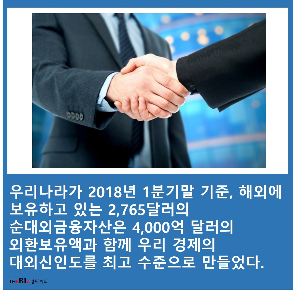 우리나라가 2018년 1분기말 기준, 해외에 보유하고 있는 2,765달러의 순대외금융자산은 4,000억 달러의 외환보유액과 함께 우리 경제의 대외신인도를 최고 수준으로 만들었다.