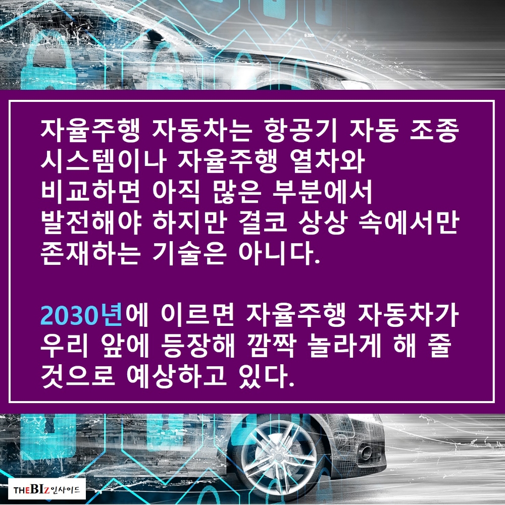 2030년에 이르면 자율주행 자동차가 우리 앞에 등장해 깜짝 놀라게 해 줄 것으로 예상하고 있다.