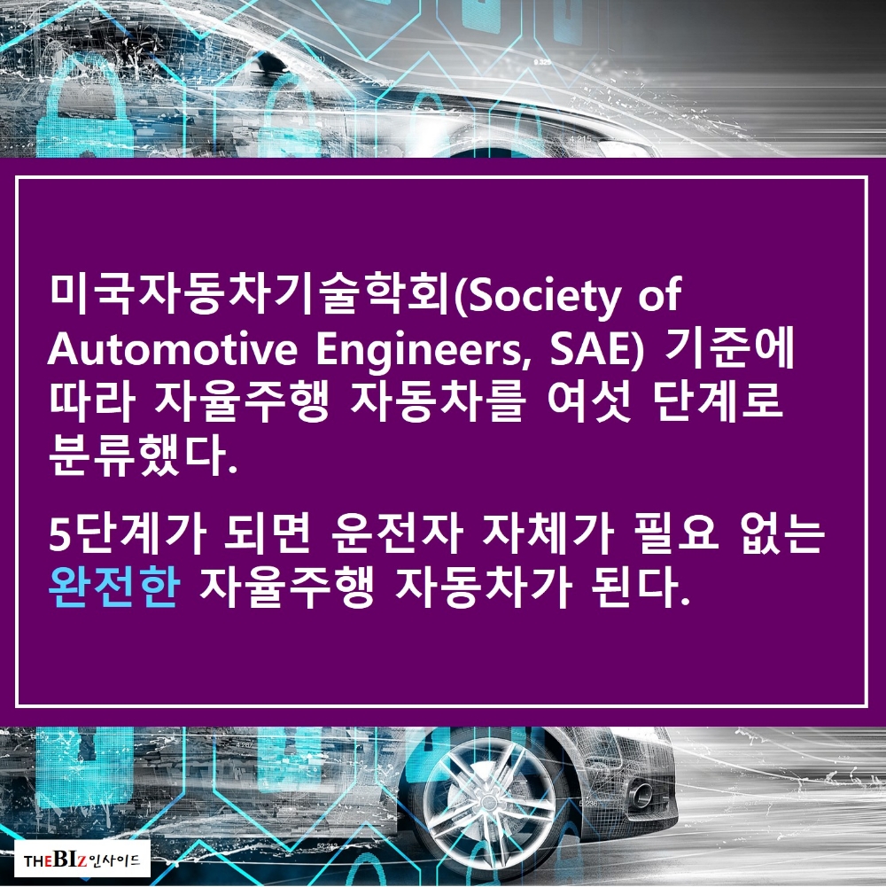 미국자동차기술학회(Society of Automotive Engineers, SAE) 기준에 따라 자율주행 자동차를 여섯 단계로 분류했다. 5단계가 되면 운전자 자체가 필요 없는 완전한 자율주행 자동차가 된다.