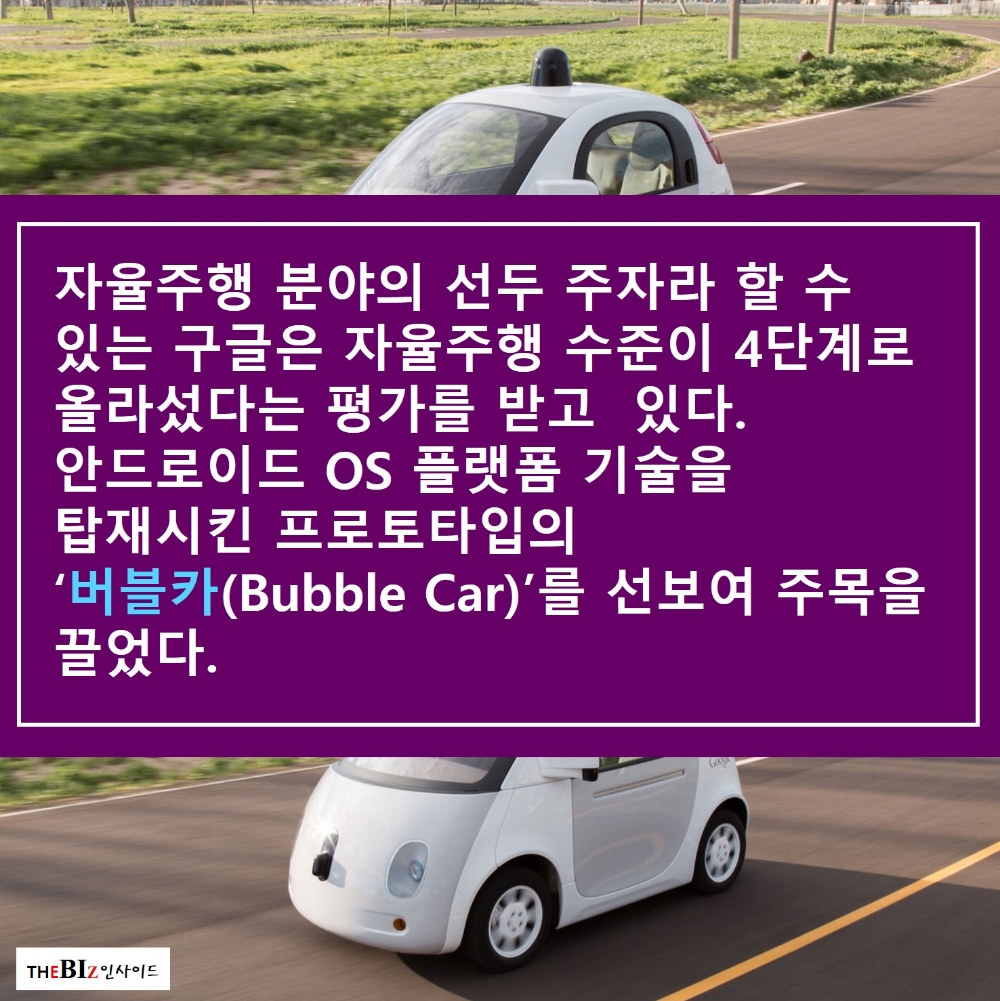 자율주행 분야의 선두 주자라 할 수 있는 구글은 자율주행 수준이 4단계로 올라섰다는 평가를 받고 있다. 안드로이드 OS 플랫폼 기술을 탑재시킨 프로토타입의 ‘버블카(Bubble Car)’를 선보여 주목을 끌었다.