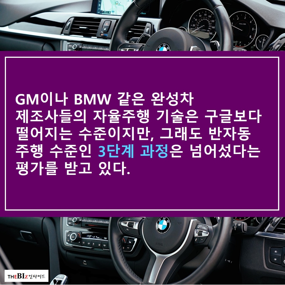 GM이나 BMW 같은 완성차 제조사들의 자율주행 기술은 구글보다 떨어지는 수준이지만, 그래도 반자동 주행 수준인 3단계 과정은 넘어섰다는 평가를 받고 있다.
