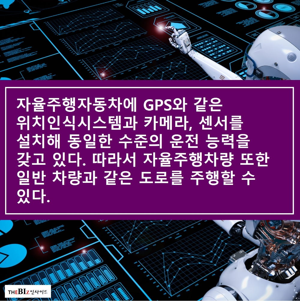 자율주행자동차에 GPS와 같은 위치인식시스템과 카메라, 센서를 설치해 동일한 수준의 운전 능력을 갖고 있다. 따라서 자율주행차량 또한 일반 차량과 같은 도로를 주행할 수 있다.