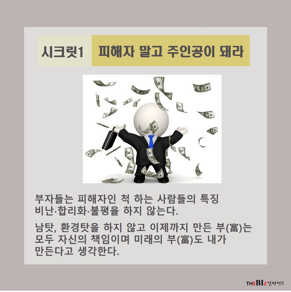 부자들는 피해자인 척 하는 사람들의 특징 비난-합리화-불평을 하지 않는다. 남탓, 환경탓을 하지 않고 이제까지 만든 부는 모두 자신의 책임이며 미래의 부도 내가 만든다고 생각한다.