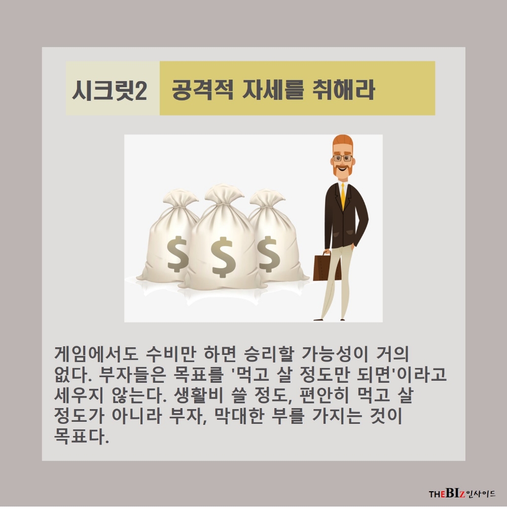 게임에서도 수비만 하면 승리할 가능성이 거의 없다. 부자들은 목표를 '먹고 살 정도만 되면'이라고 세우지 않는다. 생활비 쓸 정도, 편안히 먹고 살 정도가 아니라 부자, 막대한 부를 가지는 것이 목표다.