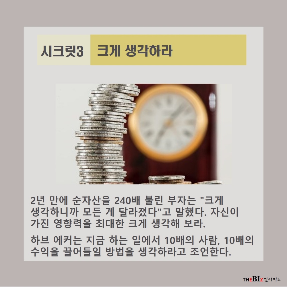 2년만에 순자산을 240배 불린 부자는 "크게 생각하니까 모든 게 달라졌다"고 말했다. 자신이 가진 영향력을 최대한 크게 생각해 보라. 하브 에커는 지금 하는 일에서 10배의 사람, 10배의 수익을 끌어들일 방법을 생각하라고 조언한다.