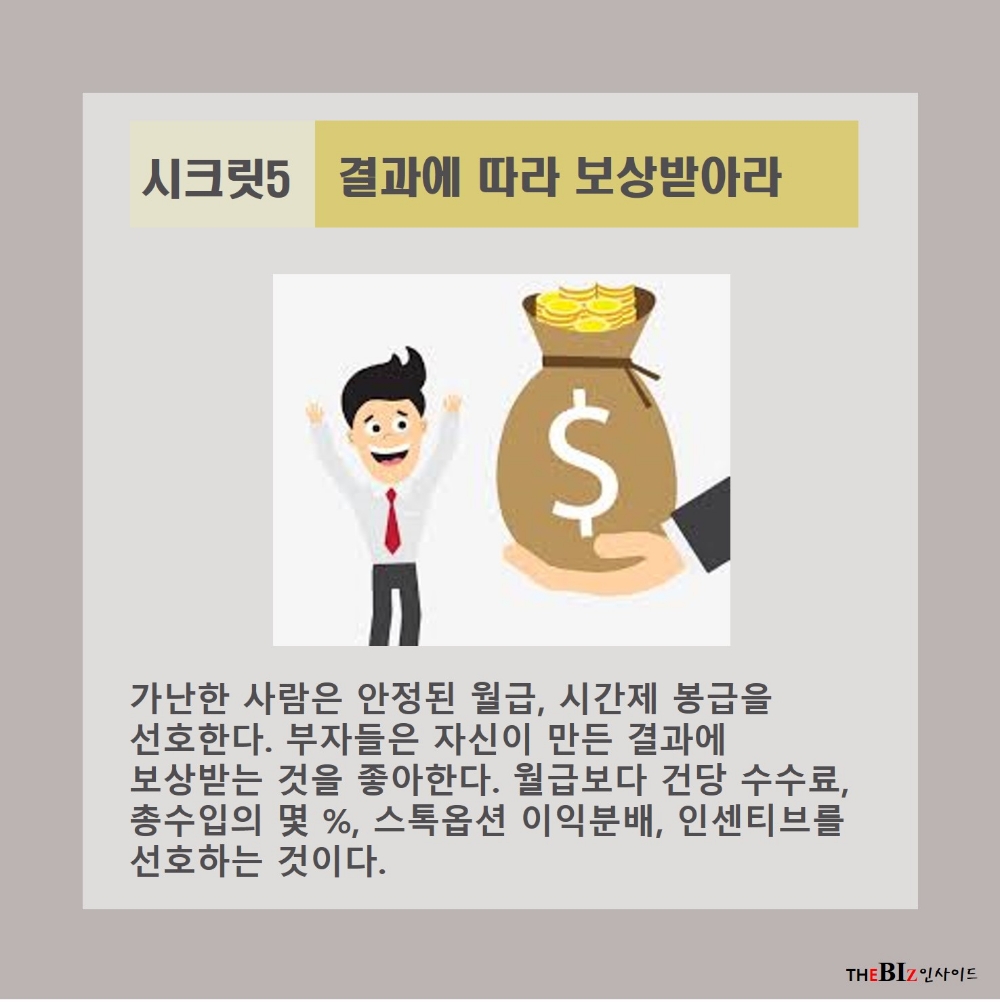 가난한 사람은 안정된 월급, 시간제 봉급을 선호한다. 부자들은 자신이 만든 결과에 보상받는 것을 좋아한다. 월급보다 건당 수수료, 총수입의 몇 %, 스톡옵션 이익분배, 인센티브를 선호하는 것이다.