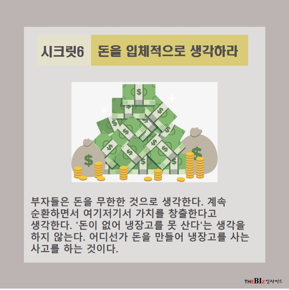 부자들은 돈을 무한한 것으로 생각한다. 계속 순환하면서 여기저기서 가치를 창출한다고 생각한다. '돈이 없어 냉장고를 못 산다'는 생각을 하지 않는다. 어디선가 돈을 만들어 냉장고를 사는 사고를 하는 것이다.