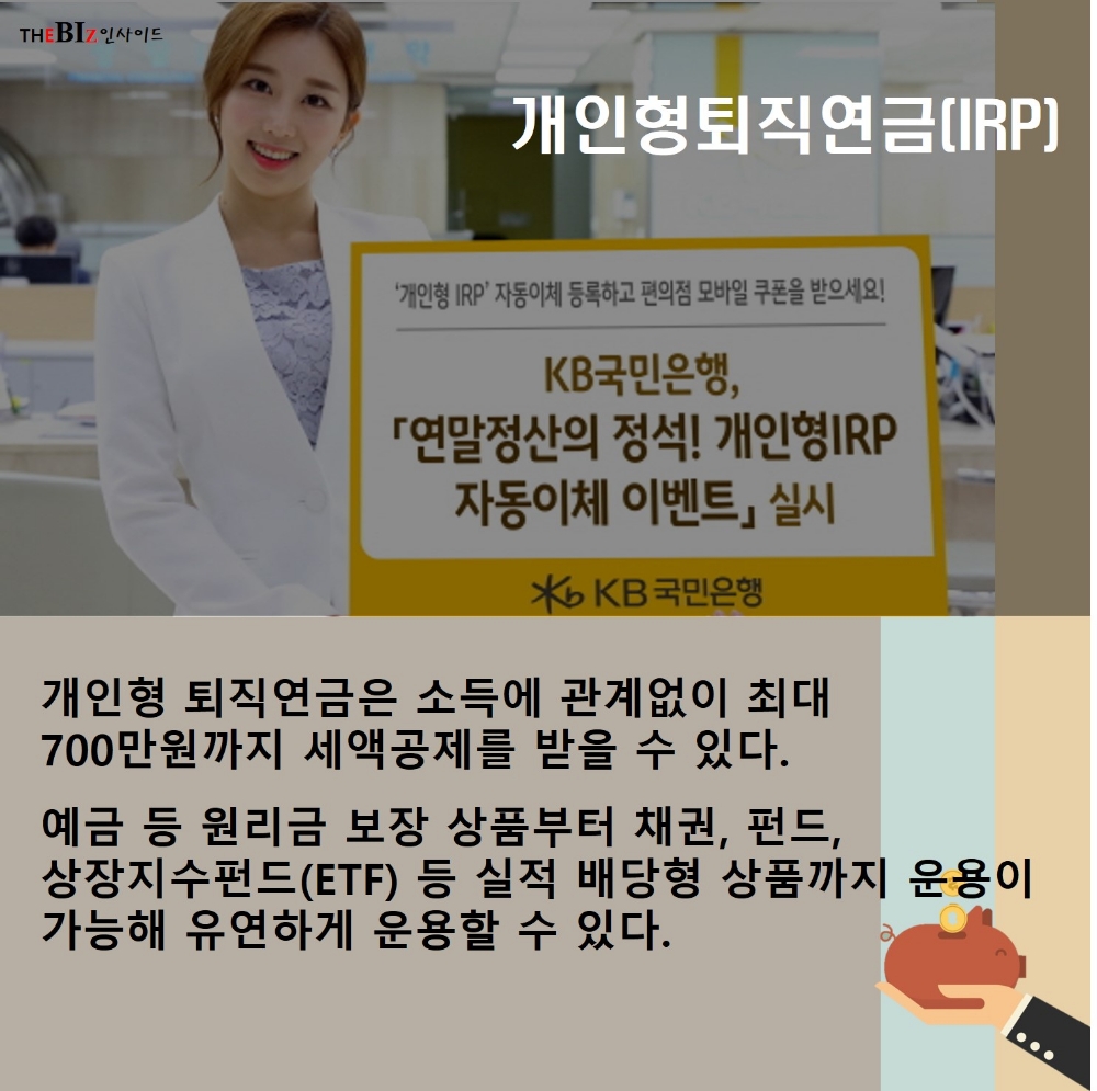 개인형 퇴직연금은 소득에 관계없이 최대 700만원까지 세액공제를 받을 수 있다. 예금 등 원리금 보장 상품부터 채권, 펀드, 상장지수펀드(ETF) 등 실적 배당형 상품까지 운용이 가능해 유연하게 운용할 수 있다.
