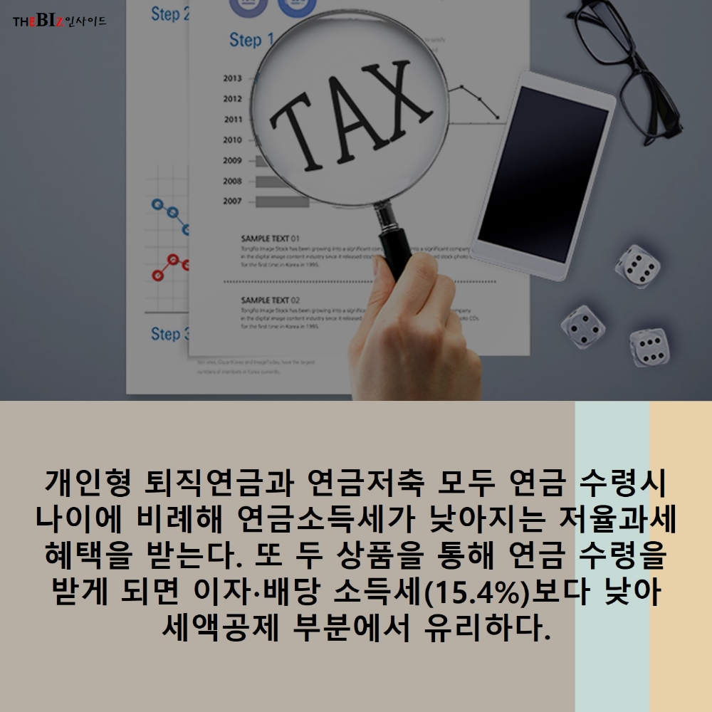 모두 연금 수령시 나이에 비례해 연금소득세가 낮아지는 저율과세 혜택을 받는다. 또 두 상품을 통해 연금 수령을 받게 되면 이자-배당 소득세(15.4%)보다 낮아 세액공제 부분에서 유리하다.