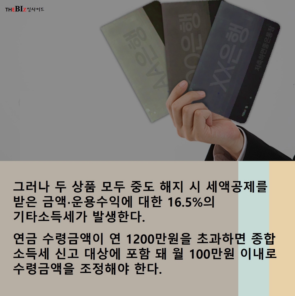 그러나 두 상품 모두 중도 해지 시 세액공제를 받은 금액-운용수익에 대한 16.5%의 기타소득세가 발생하며 연금 수령금액이 연 1200만원을 초과하면 종합 소득세 신고 대상에 포함 돼 월 100만원 이내로 수령금액을 조정해야 한다.