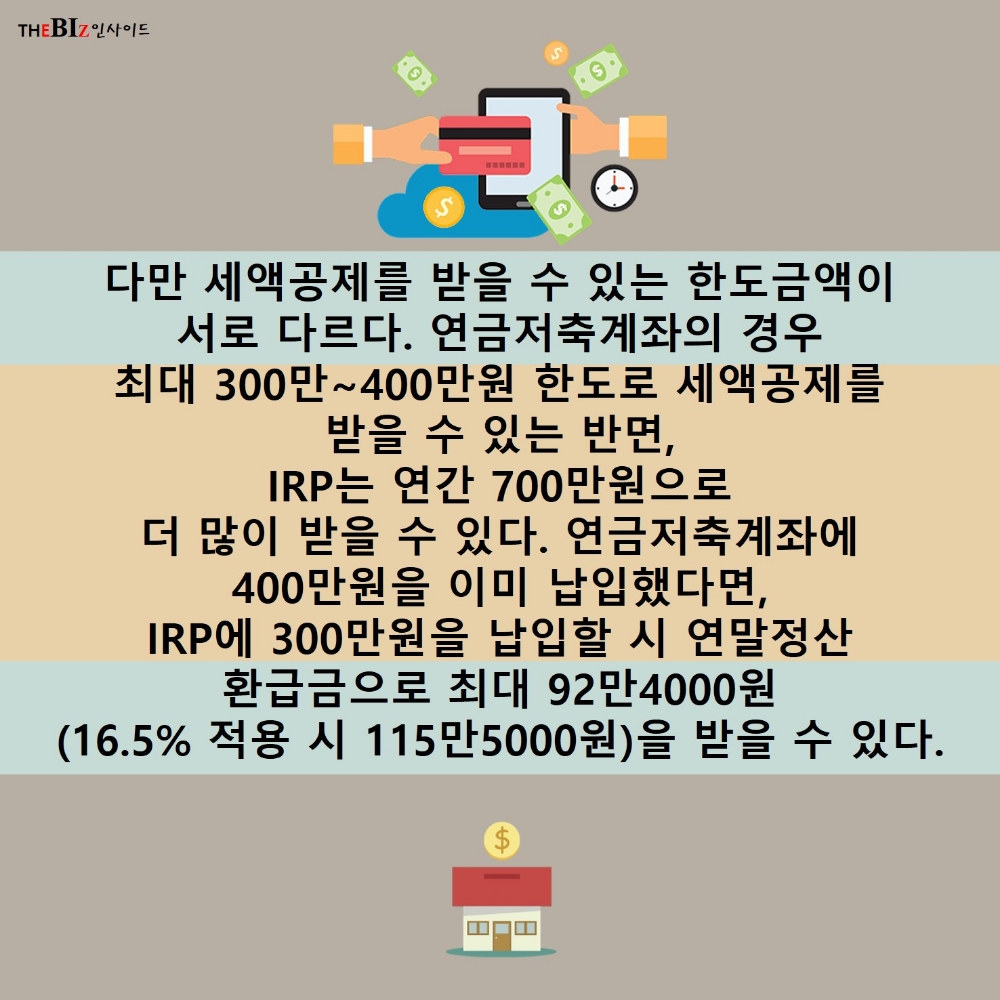 계좌의 경우 최대 300만~400만원 한도로 세액공제를 받을 수 있는 반면, IRP는 연간 700만원으로 더 많이 받을 수 있다. 연금저축