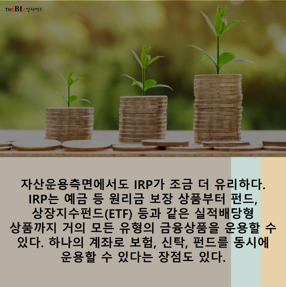 자산운용측면에서도 IRP가 조금 더 유리하다. IRP는 예금 등 원리금 보장 상품부터 펀드, 상장지수펀드(ETF) 등과 같은 실적배당형 상품까지 거의 모든 유형의 금융상품을 운용할 수 있다. 하나의 계좌로 보험, 신탁, 펀드를 동시에 운용할 수 있다는 장점도 있다.