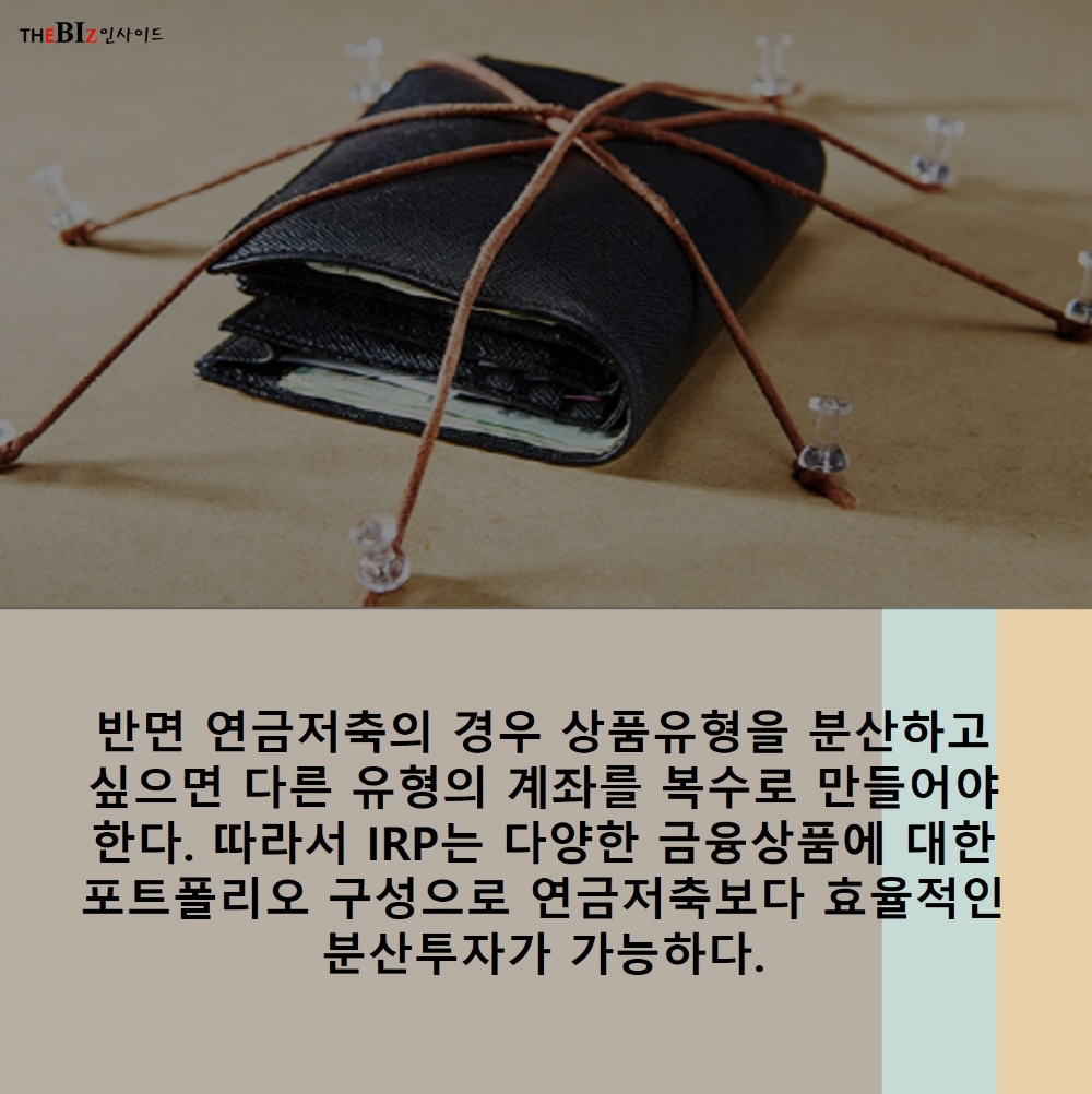 의 경우 상품유형을 분산하고 싶으면 다른 유형의 계좌를 복수로 만들어야 한다. 따라서 IRP는 다양한 금융상품에 대한 포트폴리오 구성으로 연금저축