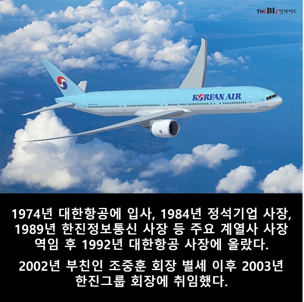 1974년 대한항공에 입사, 1984년 정석기업 사장, 1989년 한진정보통신 사장 등 주요 계열사 사장 역임후 1992년 대한항공 사장에 올랐다. 2002년 부친인 조중훈 회장 별세 이후 2003년 한진그룹 회장에 취임했다.