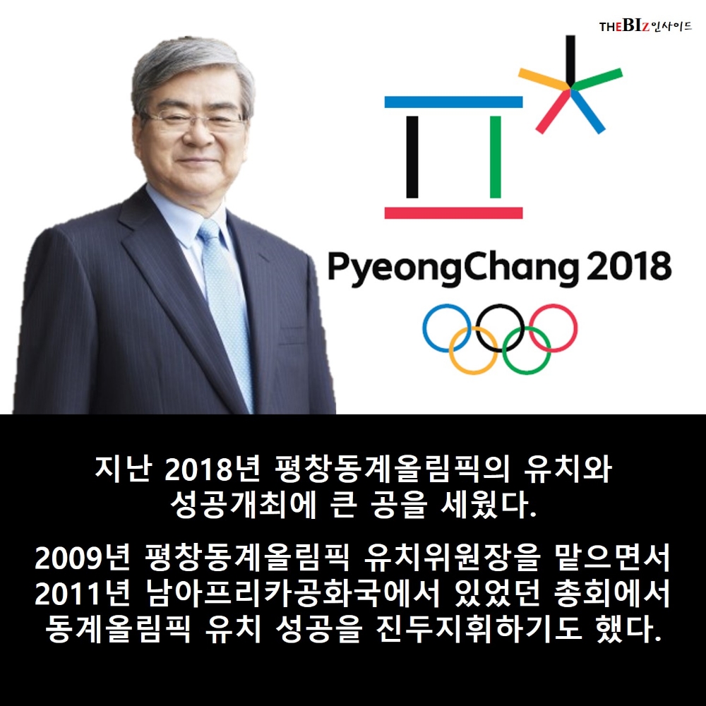 지난 2018년 평창동계올림픽의 유치와 성공개최에 큰 공을 세웠다. 2009년 평창동계올림픽 유치위원장을 맡으면서 2011년 남아프리카공화국에서 있었던 총회에서 동계올림픽 유치 성공을 진두지휘하기도 했다.