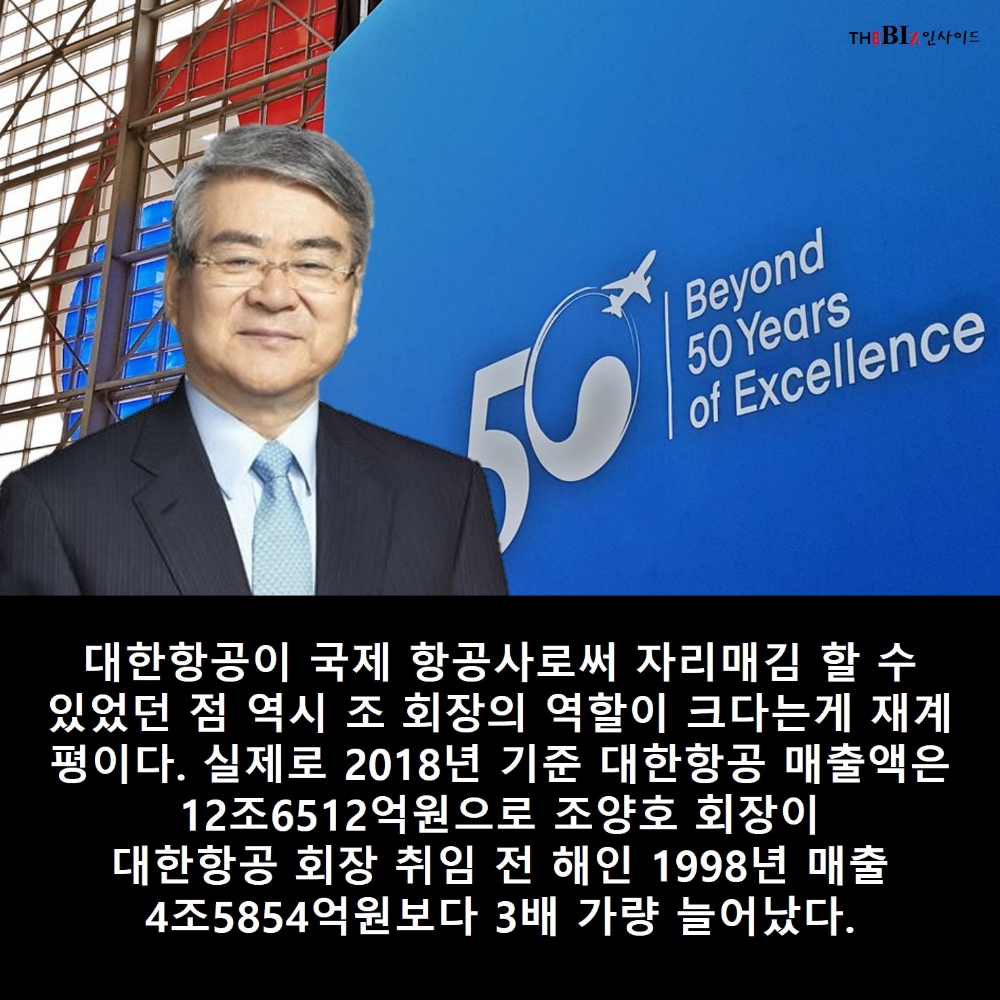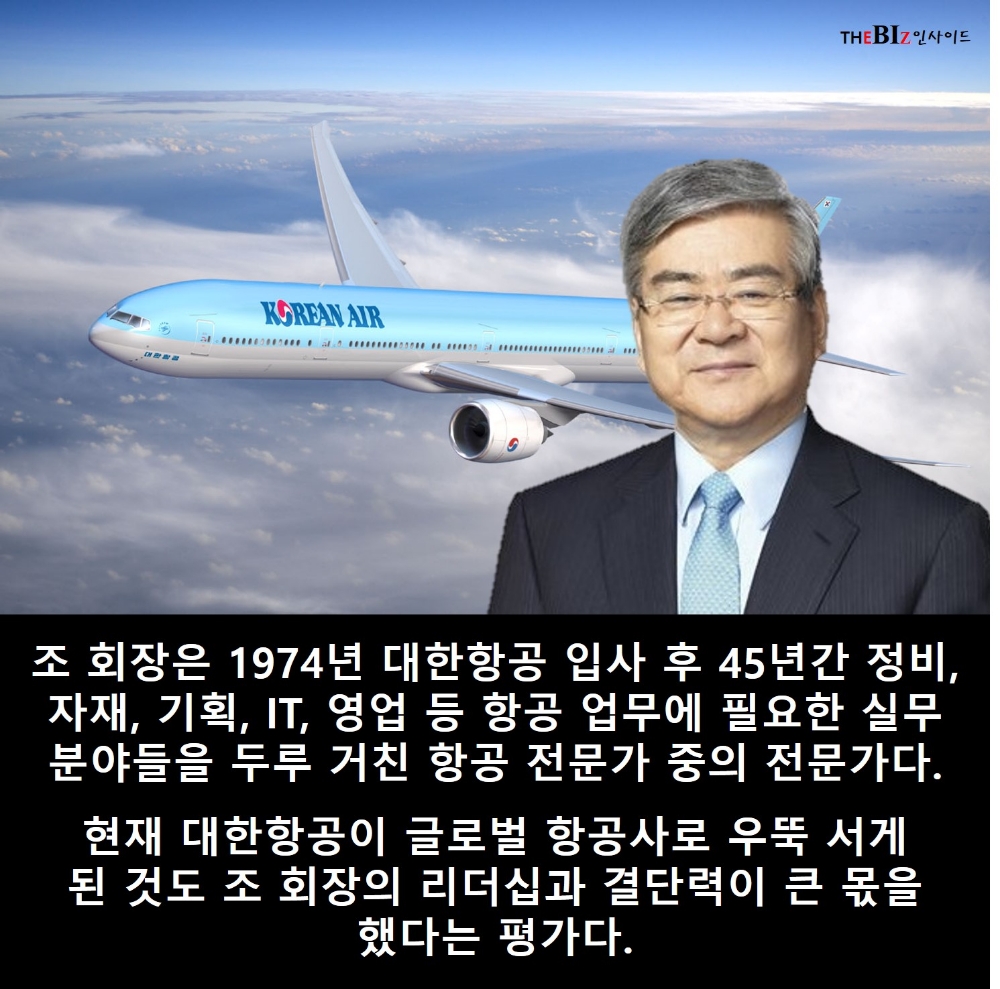 조 회장은 1974년 대한항공 입사 후 45년간 정비, 자재, 기획, IT, 영업 등 항공 업무에 필요한 실무 분야들을 두루 거친 항공 전문가 중의 전문가다. 현재 대한항공이 글로벌 항공사로 우뚝 서게 된 것도 조 회장의 리더십과 결단력이 큰 몫했다는 평가다.