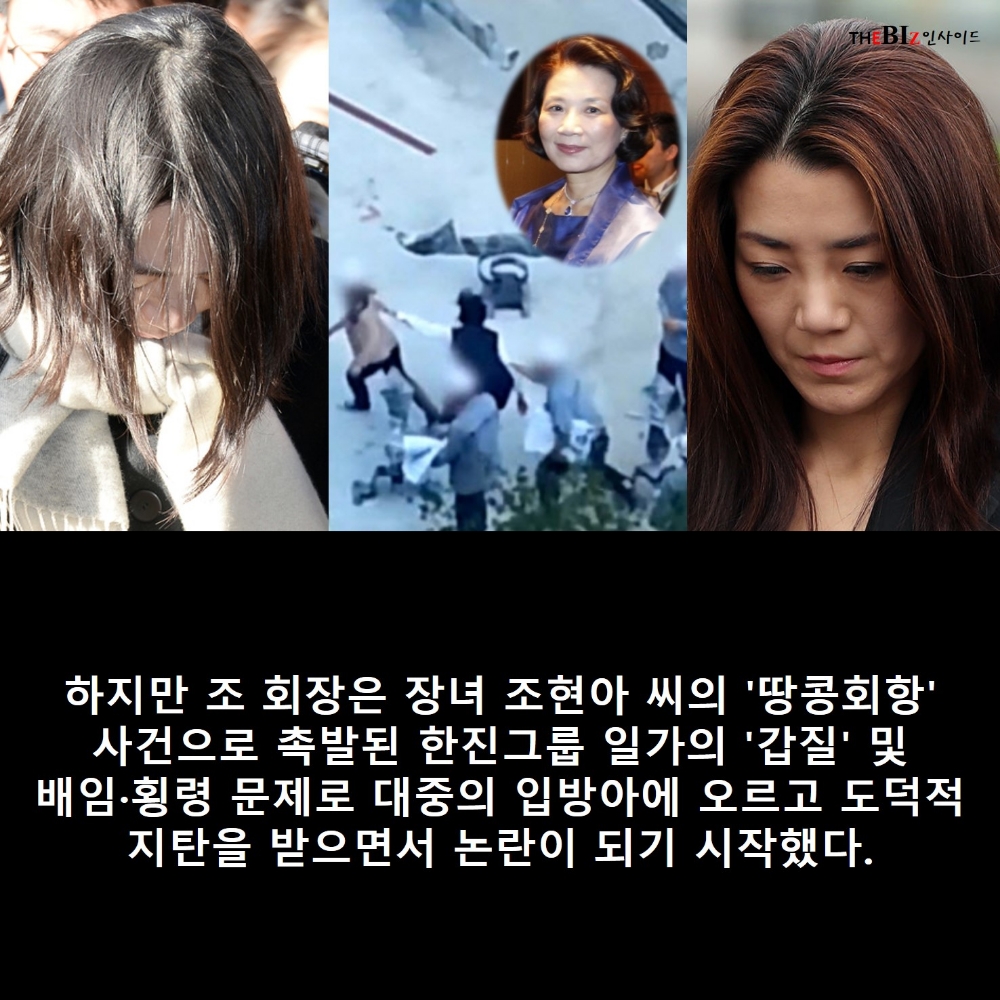 하지만 조 회장은 장녀 조현아 씨의 '땅콩회항' 사건으로 촉발된 한진그룹 일가의 '갑질' 및 배임·횡령 문제로 대중의 입방아에 오르고 도덕적 지탄을 받으면서 입방아에 오르기 시작했다.